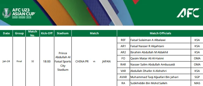 世俱杯下注-亚足联官方:U23亚洲杯决赛中日之战由沙特裁判组执裁